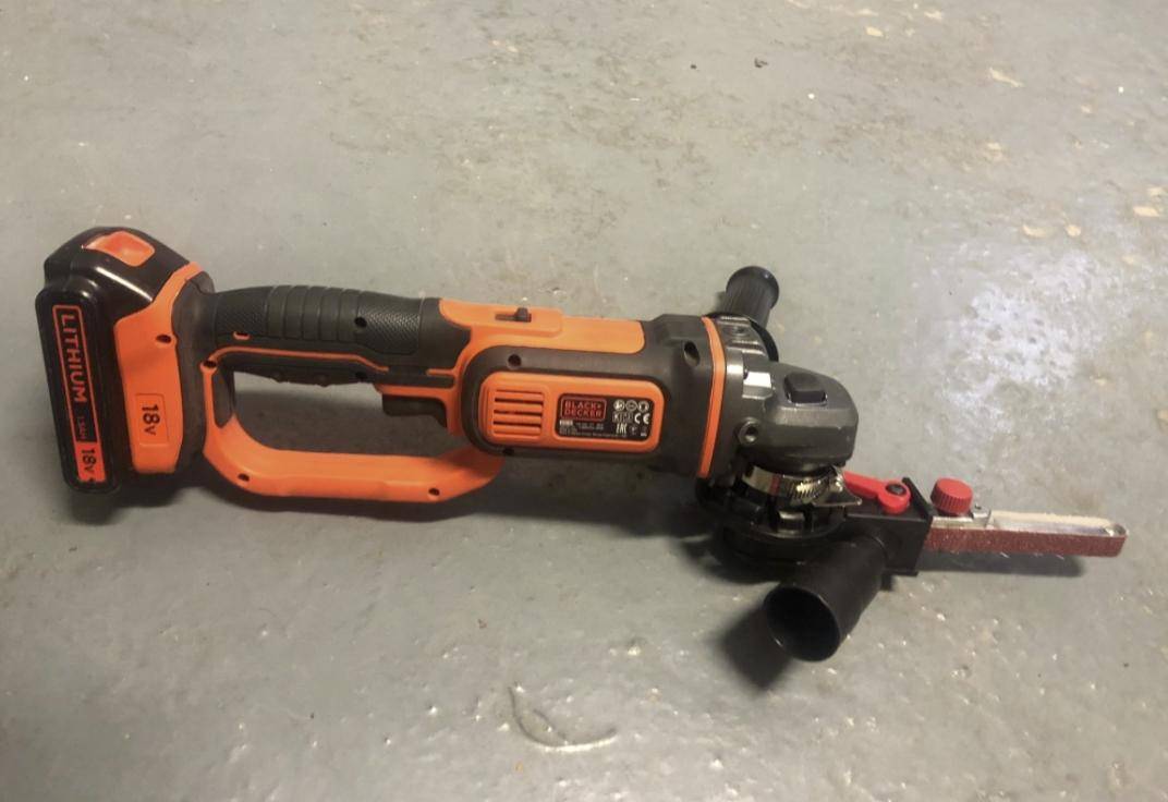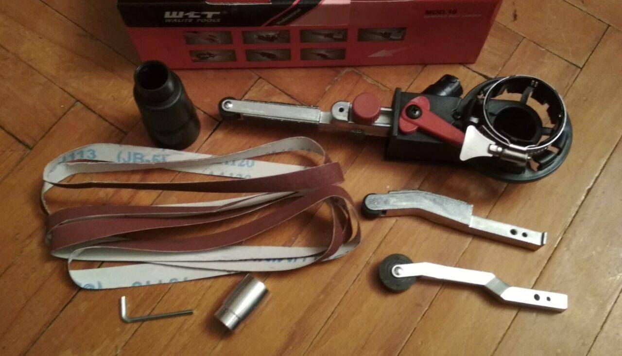 Насадка представляет собой узкую конструкцию, с ручкой и основой, на которую крепится шлифовальная лента (наждачная бумага, склеенная специальным образом). Этот адаптер подключается к «болгарке», длина его рабочего органа составляет 115 мм.