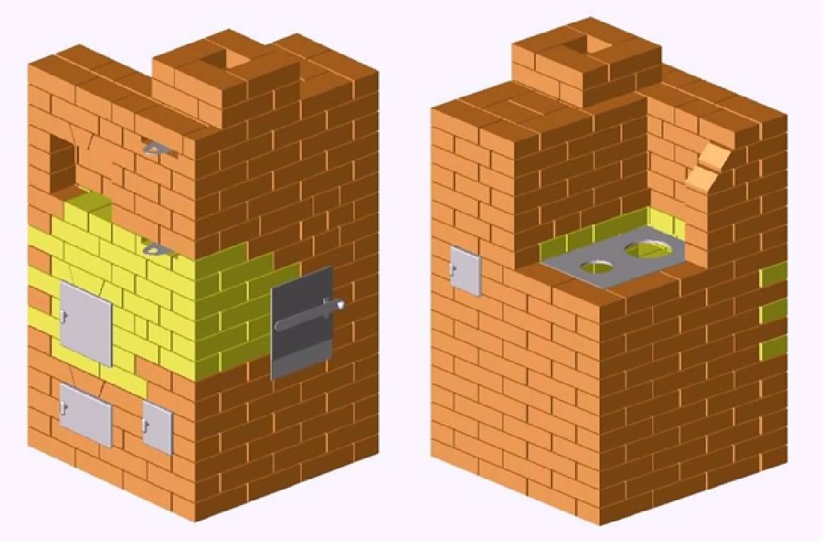 Кирпичные конструкции имеют существенный недостаток – они обладают значительным весом, что требует при использовании такой конструкции изготовления под нее фундаментного основания. Для постройки такого печного оборудования применяется огнеупорный и красный обожженный кирпич, а также раствор, изготовленный на основе глины и песка в качестве связующего состава. Раствор на основе цемента при создании такой конструкции не применяется, так как под действием высоких температур цементный раствор трескается, и конструкция утрачивает свою целостность. При создании кирпичной конструкции, кирпичи следует укладывать в определенном порядке.