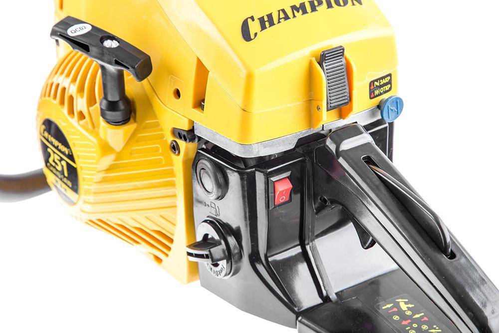 Бытовая бензопила, с низкой мощностью двигателя (1,9 л. с.), является одной из простых и стандартных изделий Чемпион.
