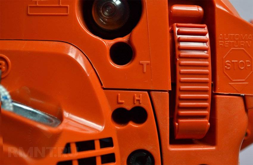 - Если бензопила при подаче газа глохнет – двигателю не хватает топлива, чтобы развить обороты. Количество топлива регулируют винтом H (главный винт). Его выкручивают на 1/4 оборота и дают газ. Если двигатель стал работать лучше, выкручивают ещё на 1/4 оборота. (Если хуже, то закручивают на 1/4 оборота в обратную сторону).