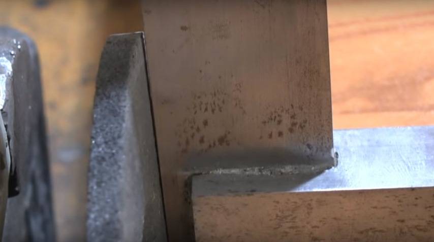 Затем болгарку зажимают в тиски, а стол для укладки шины поднимают до уровня диска.