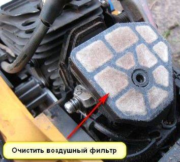 - засорение воздушного фильтра. Этот элемент пилы нужно регулярно чистить от мусора, мелких насекомых и пыли. В противном случае воздух не будет попадать в карбюратор, где он должен обогащать топливную смесь. В результате этого пила перестанет заводиться. Чтобы решить проблему, потребуется очистить фильтр, или заменить его.
