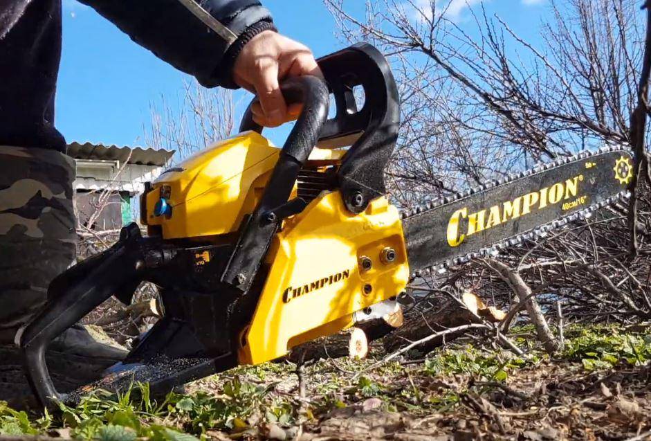 - Чемпион – 38cc: небольшой вес, хромированный цилиндр, хорошо сбалансированный корпус – вот основные отличия этой бензопилы