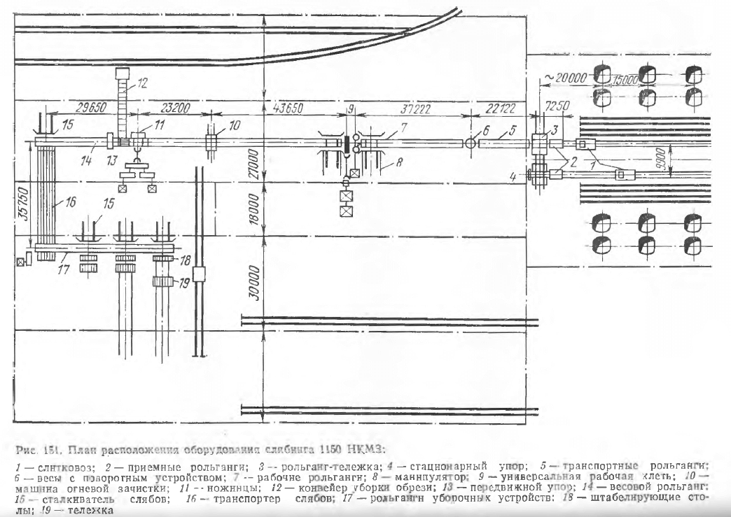 За ножницами на рольганге с вмонтированными в него автоматическими весами слябы взвешиваются и затем могут двигаться по трем направлениям: непосредственно на листовые станы для дальнейшей прокатки без промежуточного нагрева; к методическим печам для подогрева и затем на листовые стали для дальнейшей прокатки; к уборочным устройствам, расположенным на складе слябов.