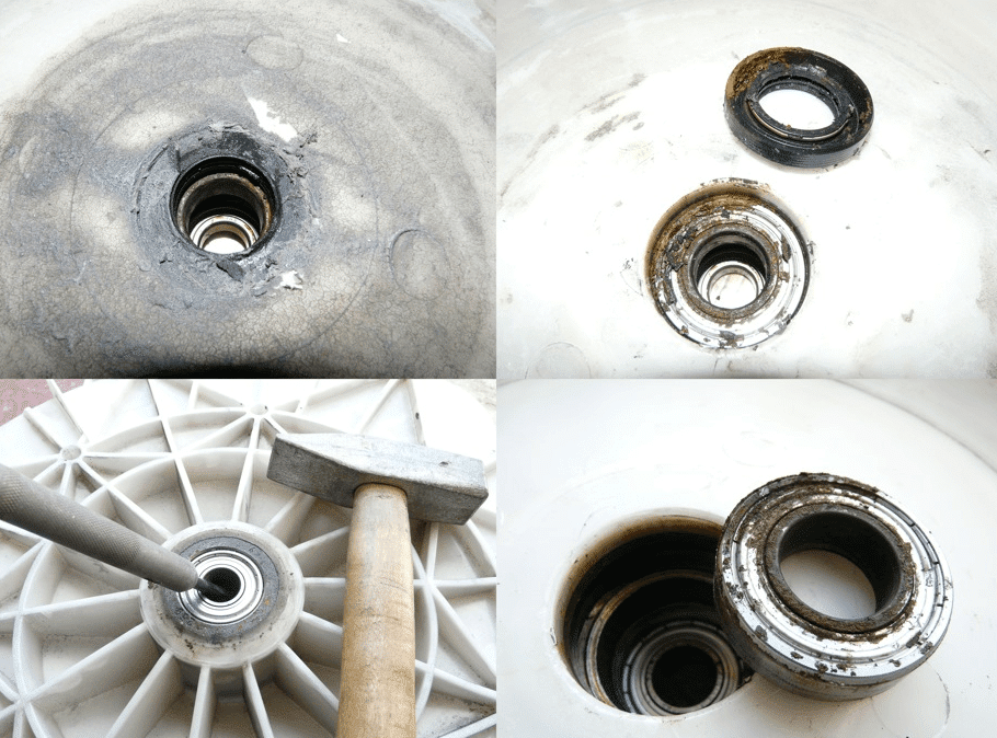 Практически для снятия барабана потребуется разобрать всю машинку. В баке слабая деталь, это подшипник. Чтоб добраться до него, нужно установить бак сальником вверх и выбить подшипник с помощью зубила и молотка. Современные модели выпускаются с литым подшипником, т. е. отдельно от бака заменить его не получится.