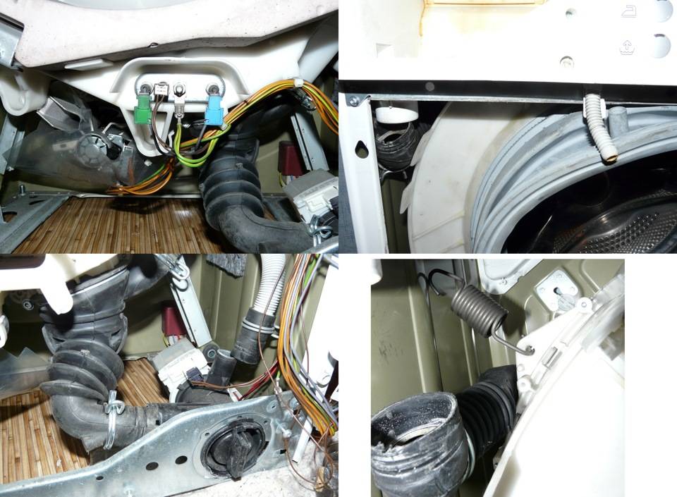 Уберите кюветку, отсоединяя соответствующий патрубок. Входной клапан также отсоедините от своего патрубка. Далее наступает очередь прессостата и фильтра, подавляющего помехи. С прессостата снимают трубку. Все отсоединенные детали извлекают наружу. Вверху ничто не мешает извлечению узла.