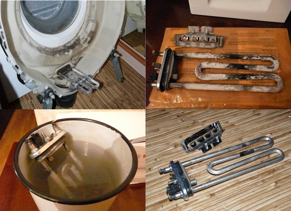 Разобрав СМ, осмотрите ее элементы — если что-то износилось, замените. Теперь вы можете увидеть, сколько накипи образовалось на ТЭНе и стенках бака, если пренебрегали профилактической чисткой. Прежде чем ставить назад элементы, почистите их — это продлит срок их службы.