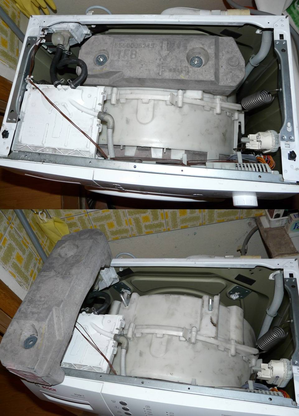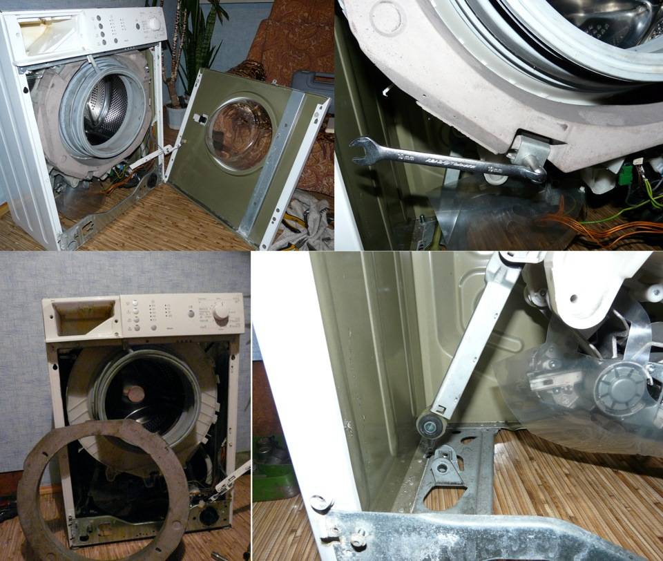 Открутив болтовые соединения, которыми крепится стенка, уберите ее. Станут видны «внутренности» машинки. Теперь откручивайте планку, соединяющую половинки корпуса. Действуя подходящим ключом, уберите противовес, расположенный наверху. Потом аналогично уберите противовесы, находящиеся возле загрузочного люка.
