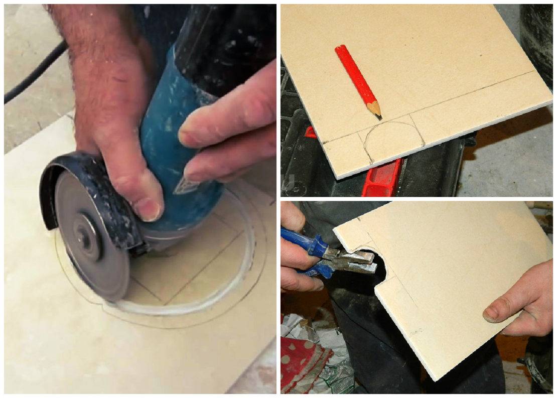Чтобы сделать закругление на плитке, что порой необходимо при прокладке трубопровода или монтаже сантехнического оборудования, используется дрель, плоскогубцы, болгарка, лобзик или стеклорез. Фигурная обрезка кафеля – ответственное занятие. Несмотря на это, приложив немного усилий, можно сделать все, используя плоскогубцы и гвоздь. Острым кончиком гвоздя наносятся царапины, после чего плоскогубцами отламываются ненужные кусочки кафеля. Но более маневренными в этом деле считаются кусачки с карбидными зажимами.