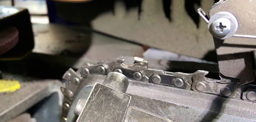Принцип заточки цепи на специальном станке заключается в том, что предварительно фиксируется оснастка в тисках инструмента. Чтобы наточить ее, понадобится обязательно снять с бензопилы. Далее закрепленная в тисках станка оснастка располагается под соответствующим углом (в зависимости от указателя). После этого осуществляется непосредственный контакт с вращающимся абразивным диском.