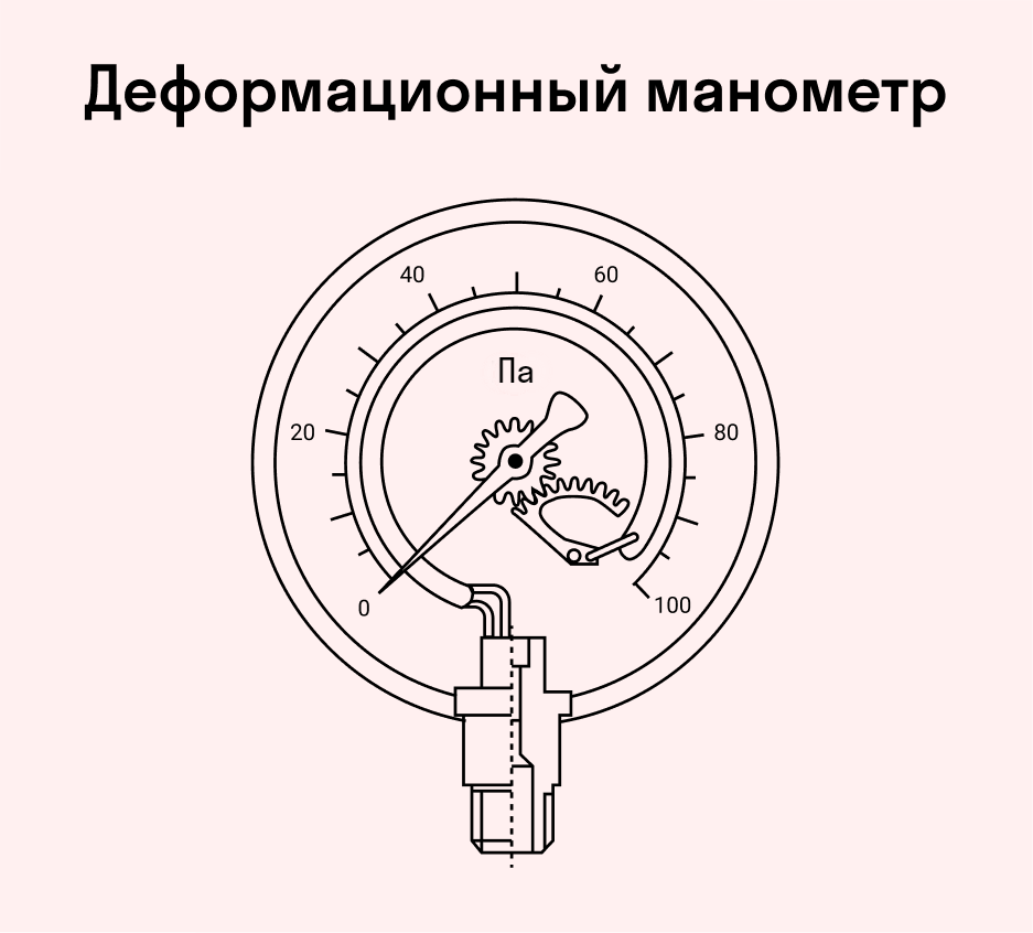 Манометр деформационного типа — это компактное механическое устройство, измеряющее давление сразу в паскалях (без перевода из других единиц). Его рабочим элементом является дугообразная или спиральная трубка Бурдона, в которую накачивается газ. Если давление внутри трубки повышается, она начинает распрямляться, и это движение через систему тяг передается на стрелку. При снятии давления она возвращается в свое первоначальное положение.