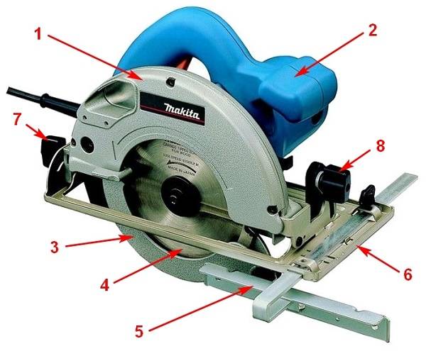Ручная дисковая пила отличается от торцовочной пилы отсутствием станины с поворотным столом, а также размещением рукоятки. Но в целом, обе модели схожи по внутреннему устройству, принципу работы и не отличаются сложностью конструкции. На следующем рисунке показано устройство ручной циркулярной пилы.