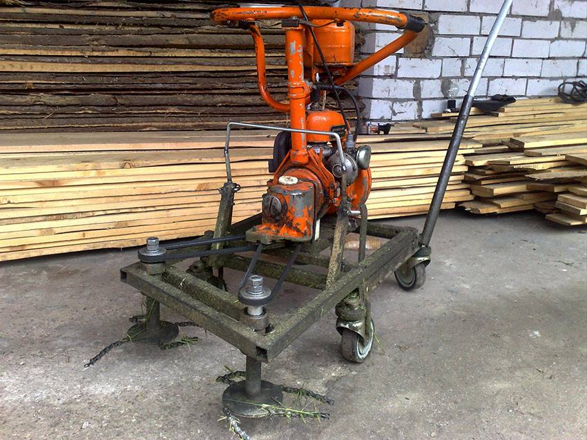 Газонокосилка тоже собирается достаточно просто. Основой служит обычная ручная четырёхколёсная тележка. На неё сверху монтируется двигатель от бензопилы. Крутящий момент передаётся на жёсткий вал, второй конец которого выведен под днище тележки. Там на него крепится либо металлический нож, либо блок с леской от триммера.