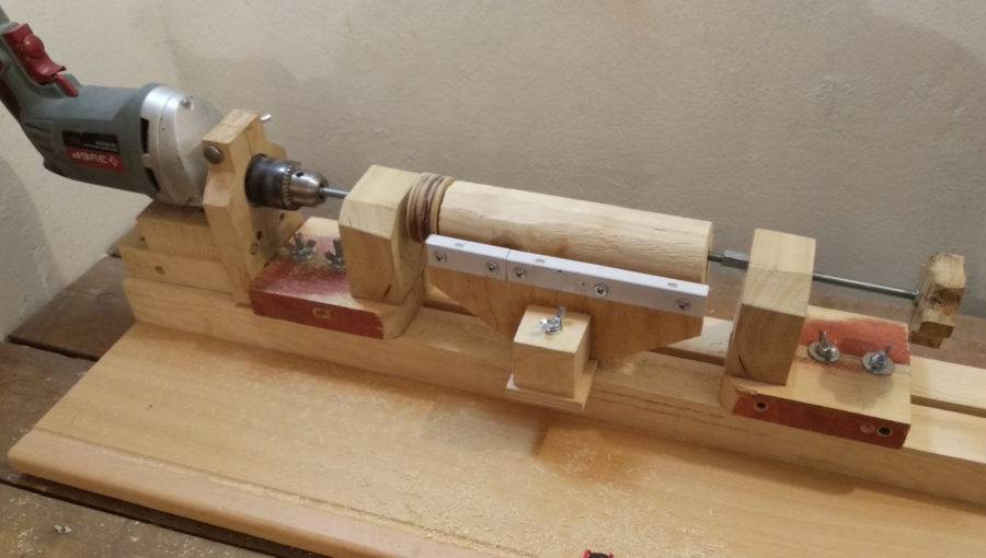 В патрон шуруповерта помещается оправка с зубьями. Для изготовления задней бабки подойдут 2 бруска с винтом для регулировки, заточенные под размеры конуса. Крепится бабка напротив шуруповерта. При этом его ось должна находиться на одном уровне с регулировочным винтом бабки.