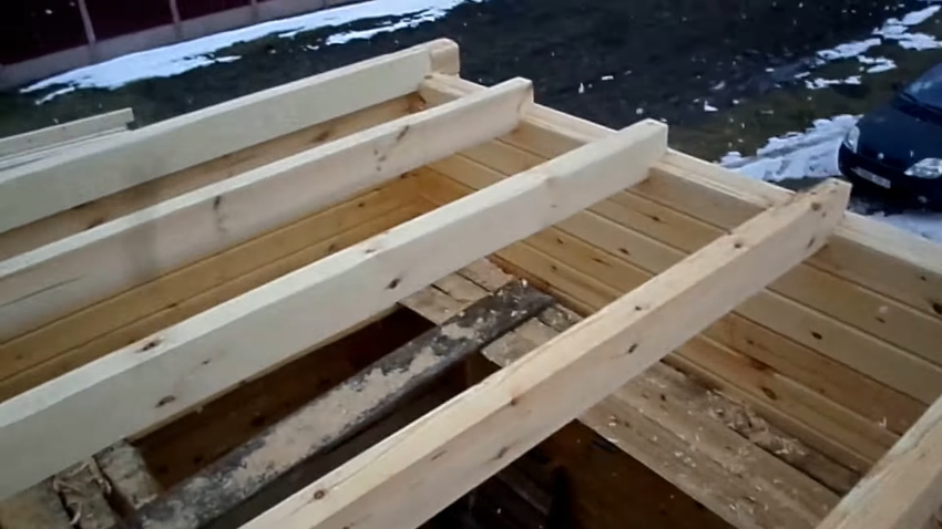 Установка наката. Его создают из щитов, сделанных из досок. Накатные пластины крепятся к черепным брусьям с сечением 4х4 или 5х5 см. Предварительно их прибивают к боковым граням несущих балок. На накат закрепляется целый потолок;