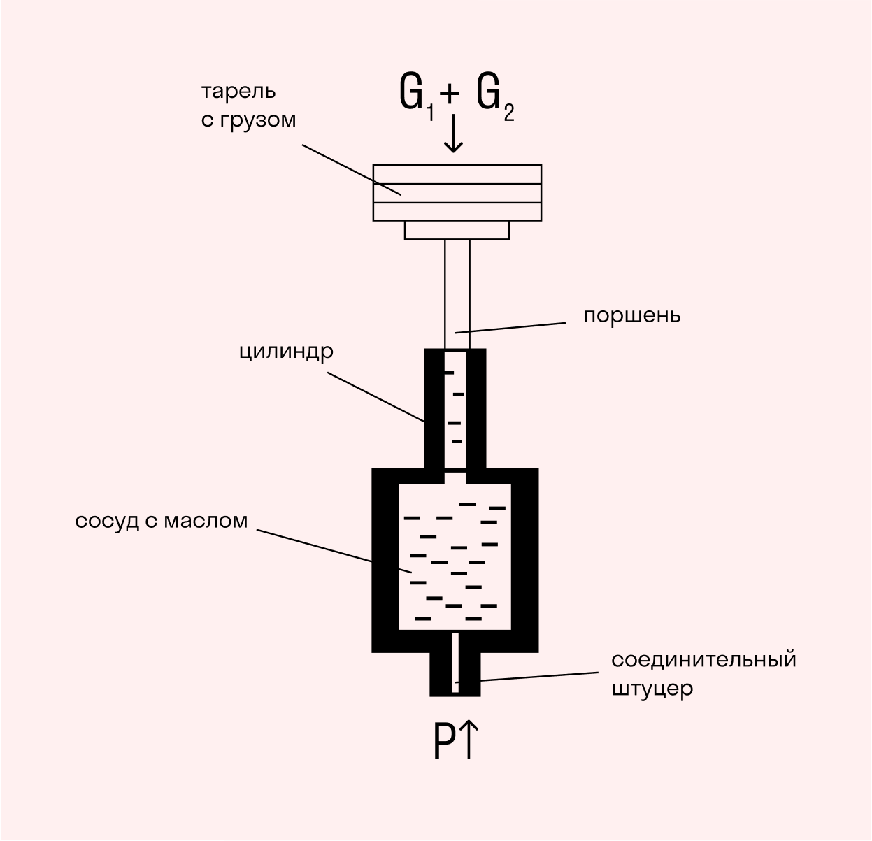 где G1— масса грузов, G2— масса поршня с тарелью, g — ускорение свободного падения, F — площадь поршня.