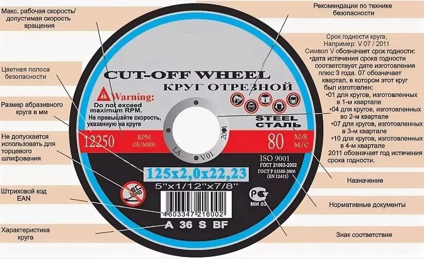 Любой абразивный круг, независимо от типа изделия, обладает специальной маркировкой, которая содержит информацию о диаметре диска, его толщине, размере посадочного места, максимальной скорости вращения. Также на диске указывается материал, для обработки которого он предназначен. Расшифровка надписей следующая: «metal» –металл, «concrete» – камень и бетон, «steel» – сталь, «aluminium – алюминий, цветные металлы и сплавы, «inox» – высоколегированная и нержавеющая сталь, «castiron» – чугун и литые детали.