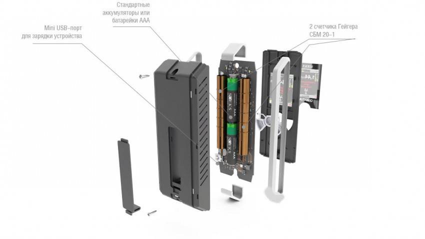 - Световой, звуковой и числовой индикаторы оповещения о превышении допустимой дозы радиации.