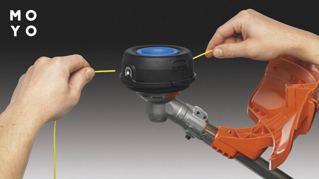 - Прежде чем заправить леску в катушку, заглушите двигатель мотокосы или обесточьте электротриммер, чтобы избежать травм, которые могут возникнуть при случайном запуске вращения режущего инструмента.