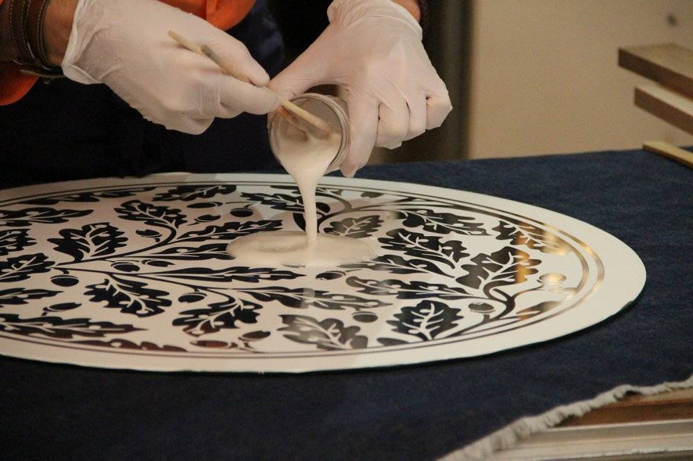 Для химической гравировки используется специальная паста для травления, которая так же деформирует верхний слой стекла, и оставляет после себя ровный матовый след. Этот вариант подходит в тех случаях, когда нужно создать сплошной узор без переходов и тонких линий.
