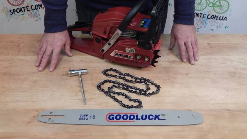 В комплекте с инструментом идёт пильная цепь с шиной и чехлом, руководство по ремонту и эксплуатации, Т-образный ключ (10х19 мм) и маленькая отвёртка.