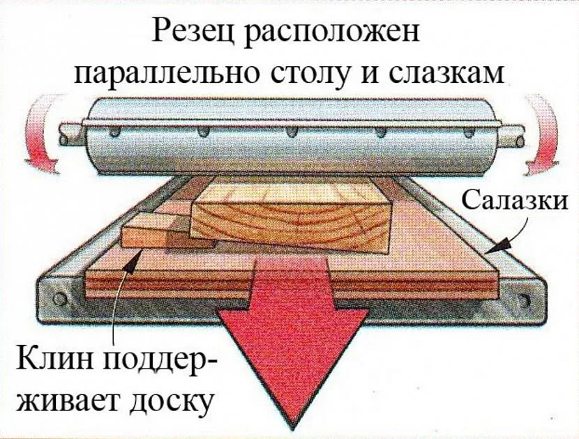 - При обработке коротких заготовок, они могут «вылететь» из-под ножей и нанести травму или повредить имущество помещения. Обезопасить протекание процесса можно сделав несущие бруски большей длины и толщины, равной тем, которые нужно отстрогать.