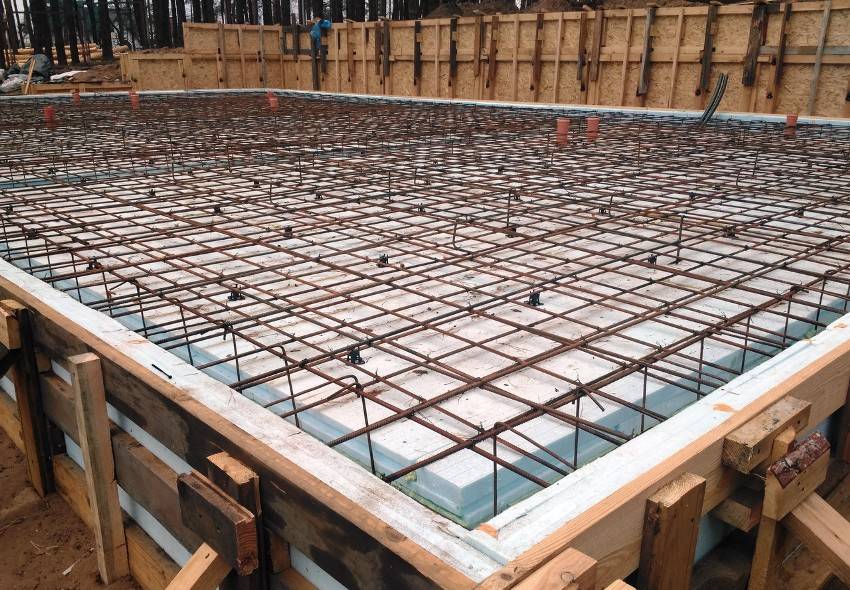 Перед тем как выполнить бетонирование, необходимо в опалубку с уложенным утеплителем установить армирующий каркас, размеры ячеек которого 20х20 см. Он придаст бетонной плите дополнительную прочность. Процесс осуществляется по следующему плану: