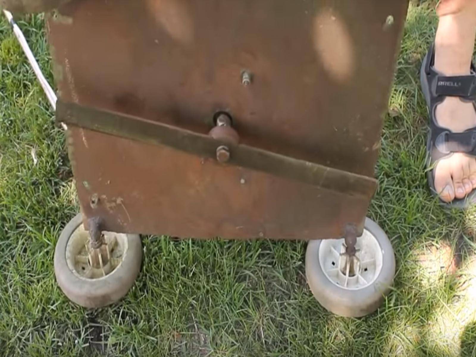 - Колеса. Используются колеса от тачки, складской тележки или детской коляски. Если коляска имеется в сборе, можно позаимствовать шасси целиком — тогда лишь останется закрепить на нем несущую основу с двигателем.