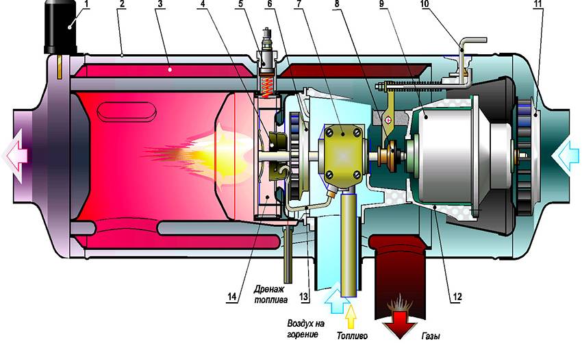 Схема горелки по принципу Бабингтона, где 1 – датчик нагрева; 2 – кожух; 3 – теплообменник; 4 – распылитель топлива; 5 – свеча накаливания; 6 – нагнетатель; 7 – топливный насос; 8 – фрикционная муфта; 9 – электродвигатель; 10 – рычажок переключения режимов работы; 11 – вентилятор; 12 – остов; 13 – топливная трубка; 14 – камера сгорания