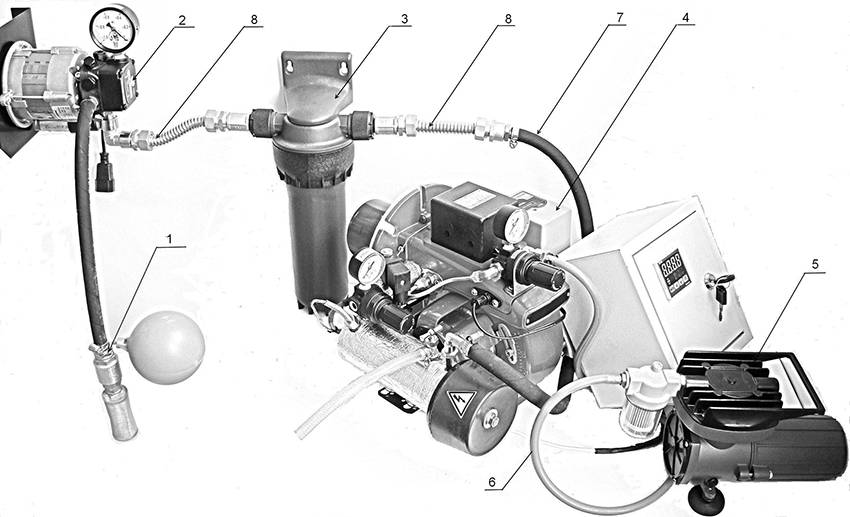 Схема сборки горелки, где 1 – топливозаборник; 2 — топливный насос; 3 – топливный фильтр; 4 – горелка; 5 – компрессор; 6 – шланг воздушного компрессора; 7 — топливный шланг; 8 – топливопровод