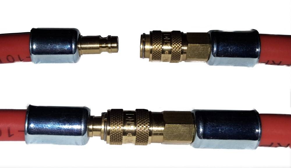 Быстроразъемные соединения часто применяются для объединения нескольких шлангов. Примером можно назвать случай, когда компрессор имеет большой вес и не может перемещаться на момент работы. В подобном случае можно использовать специальное быстроразъемное соединение для шлангов высокого давления, которое обеспечивает требуемый уровень герметичности на момент эксплуатации.