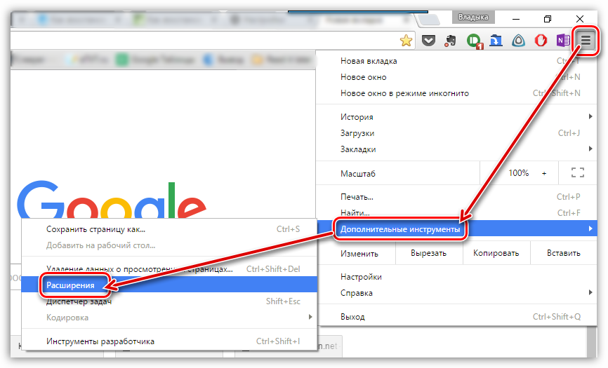 Для этого щелкните по кнопке меню Google Chrome и в отобразившемся меню перейдите к пункту «Дополнительные инструменты» – «Расширения».