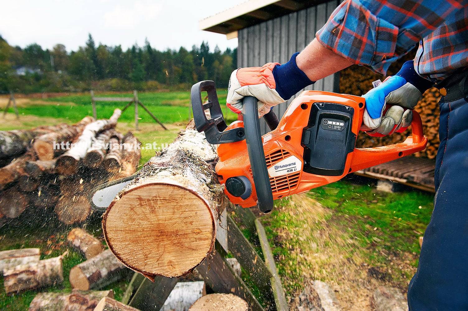 Рабочие органы бензопилы Husqvarna представлены пильной гарнитурой, состоящей из кованой металлической 35-сантиметровой шины и цепи с 52 звеньями и шагом 3/8 «. За стабильную и непрерывную смазку гарнитуры отвечает встроенный масляный насос, исправно работающий в полностью автоматическом режиме. Насос гарантирует интенсивное вращение цепи с максимальной скоростью 16,3 м/c. Этого достаточно для эффективного распила даже самой твердой древесины.