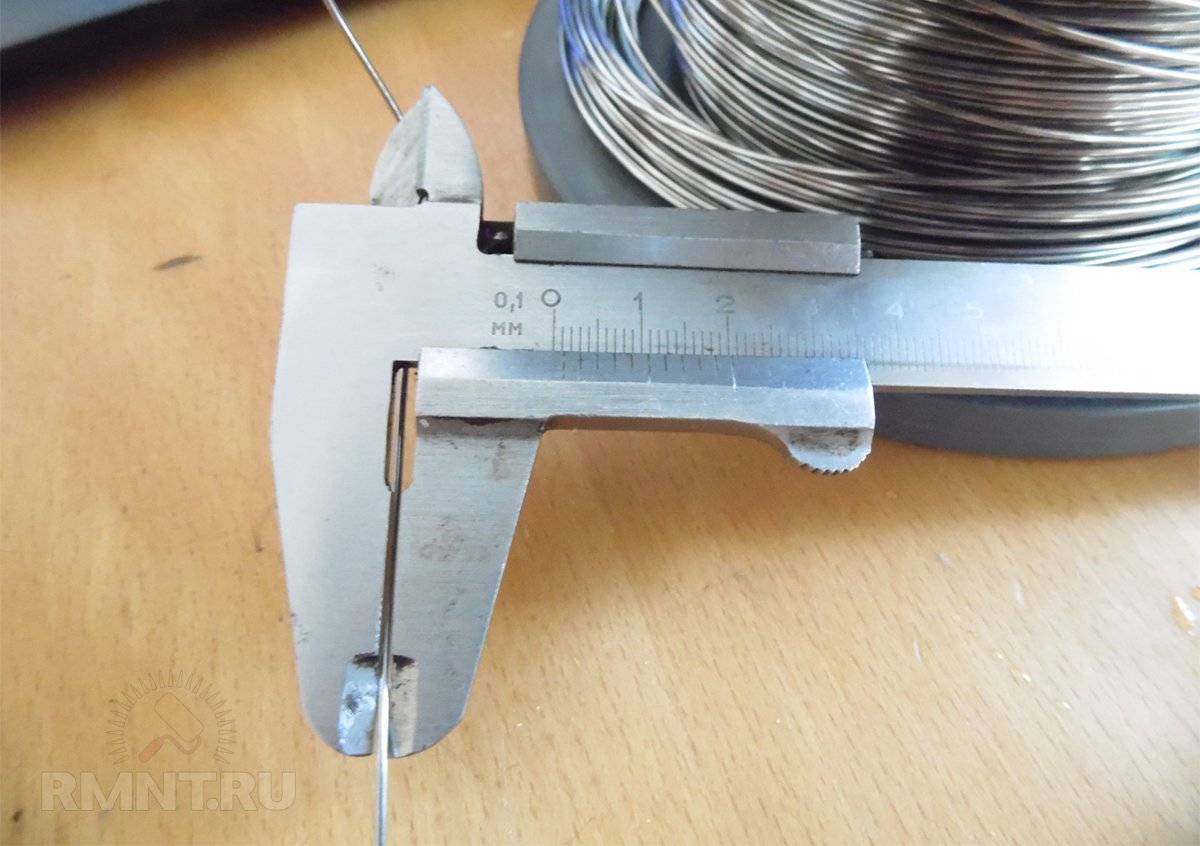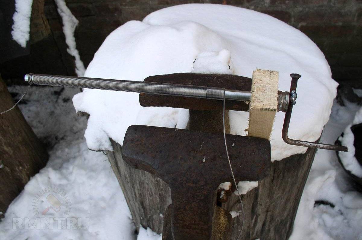 Используя эти данные, мы легко найдём необходимую длину проволоки с известной электропроводностью. Среднее удельное сопротивление фехраля составляет 1,25 Ом·мм2/м. Если использовать проволоку диаметром 0,9 мм, её сечение составит 0,64 мм2, а значит, сопротивление одного метра будет равным 0,8 Ом. Таким образом, требуется создать нагревательный элемент с общей длиной проволоки 9,83 м. Чтобы скрутить спираль, нужно воспользоваться прутком-оправкой, предварительно рассчитав длину одного витка. Если спираль имеет наружный диаметр 8 мм, длина витка получится чуть более 25 мм, то есть всего нагревательный элемент будет состоять из 393 витков.