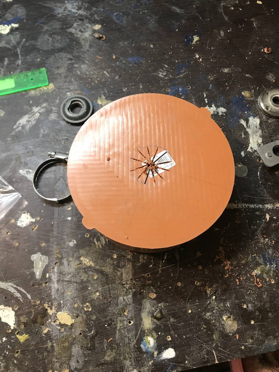- по намеченному центру сверлится отверстие, из которого ножницами по металлу надрезаются лучи из центра к краям. Получившиеся лепестки отгибаются наружу, образуя посадочный диаметр для установки на болгарку;
