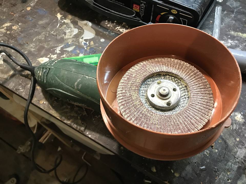 Вытяжной самодельный кожух под шлифовку изготавливается еще проще — кастрюля нужного диаметра устанавливается на посадочное отверстие, отрезается по высоте так, чтобы шлифовальный диск болгарки был полностью накрыт оставшейся частью. Затем по периметру надрезаются лепестки высотой около 5-10 мм и отгибаются наружу. На них крепится поролоновый уплотнитель для дверей или окон, который обеспечивает герметичность кожуха. Остается только изготовить отверстие в днище рядом с посадочным, и прикрепить патрубок для пылесоса. Кожух готов.
