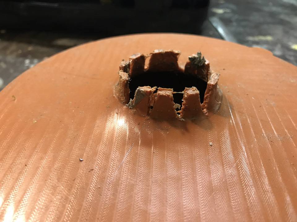 - устанавливается отрезной диск, на стенках кастрюли по кругу отмечается его положение с запасом около 1 см. Затем делаются поперечные надрезы от краев к отмеченной косильной лески, а получившиеся лепестки отгибаются внутрь. Лишние части отрезаются ножницами по металлу;