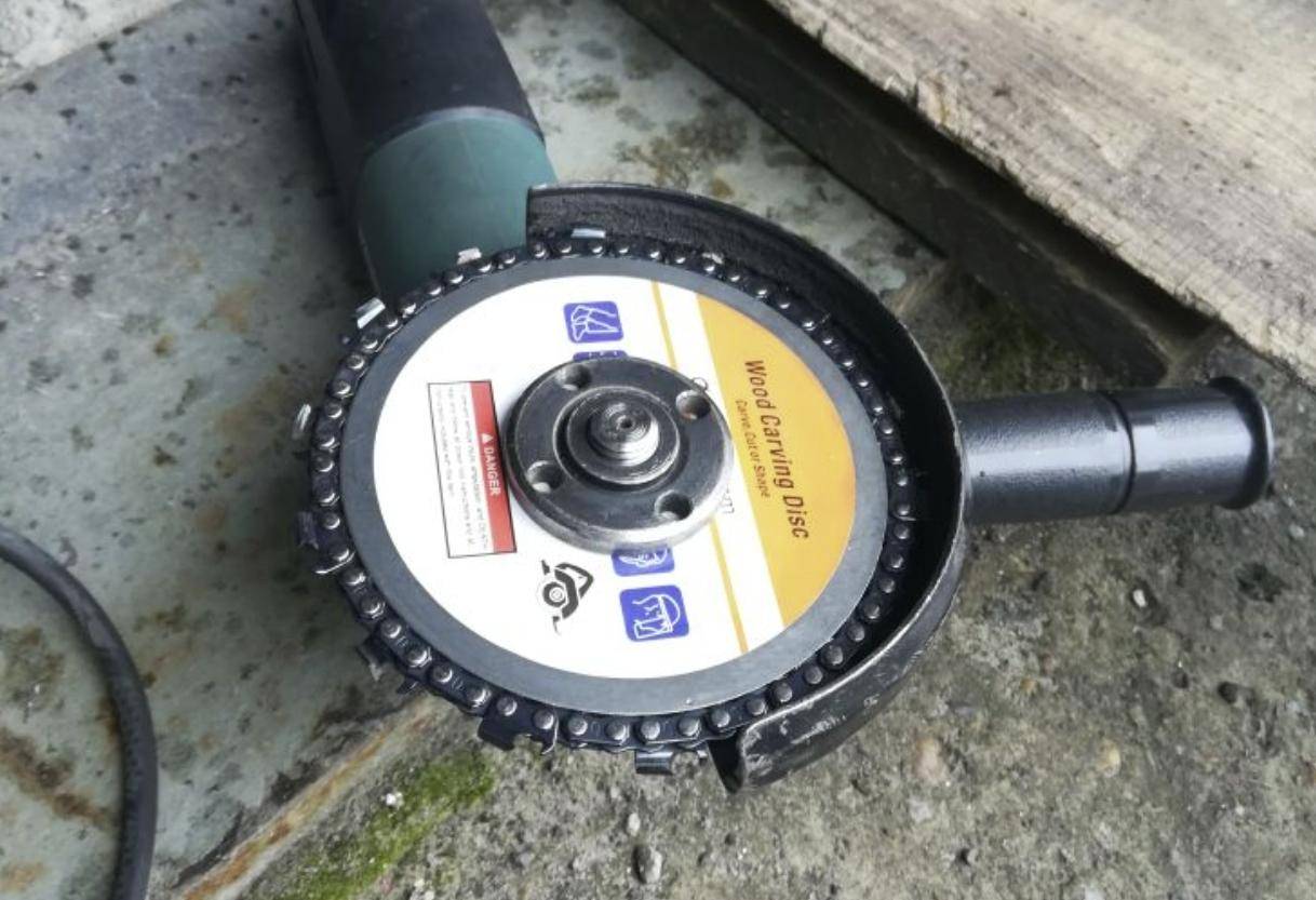 Более безопасную конструкцию имеет цепной вид насадок. Диск для распиливания, в котором применена цепь от бензопилы исключает заклинивание инструмента и снижает травмоопасность при работах. Конструкция имеет систему, позволяющую продолжать вращение основному элементу, который крепится в УШМ, а цепь может оставаться в неподвижном состоянии.