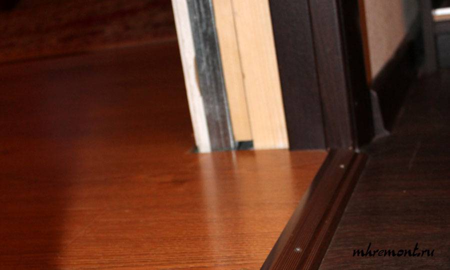 При правильной укладке в дверном проеме недолжно быть зазора между напольным покрытием и дверной коробкой. Для этого ее подпиливают таким образом, чтобы завести под нее панель.