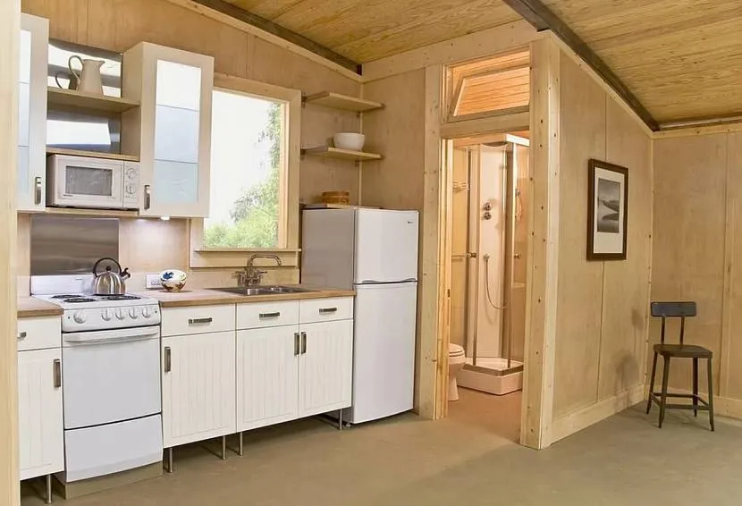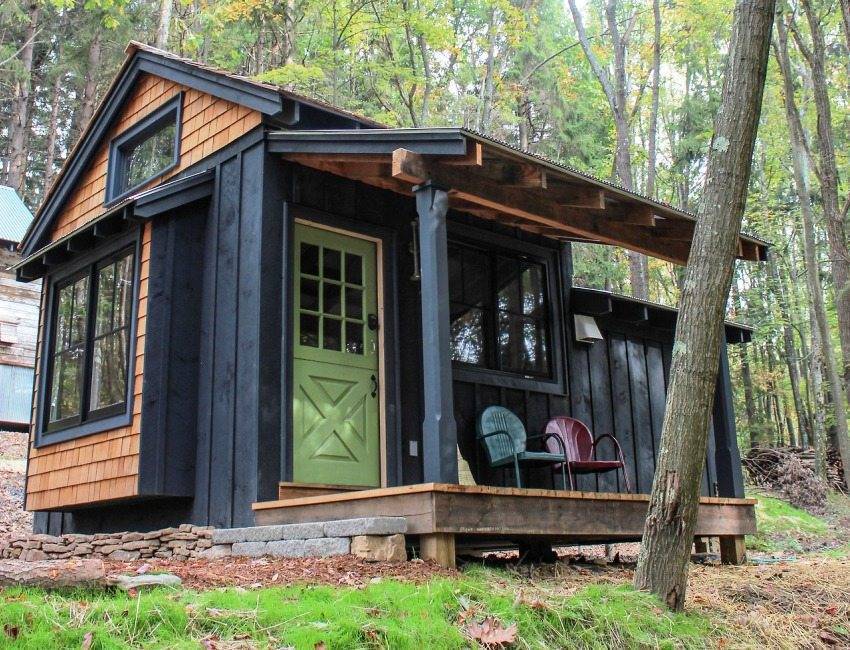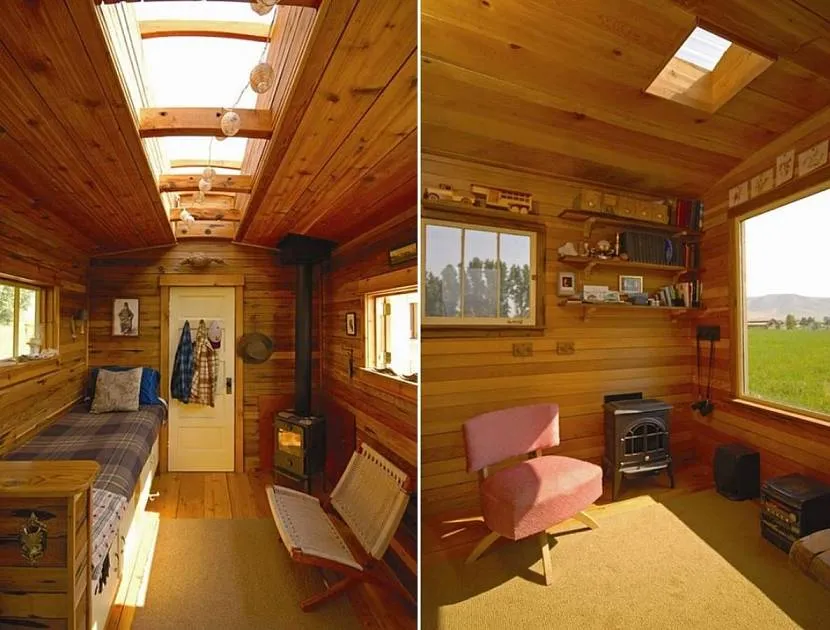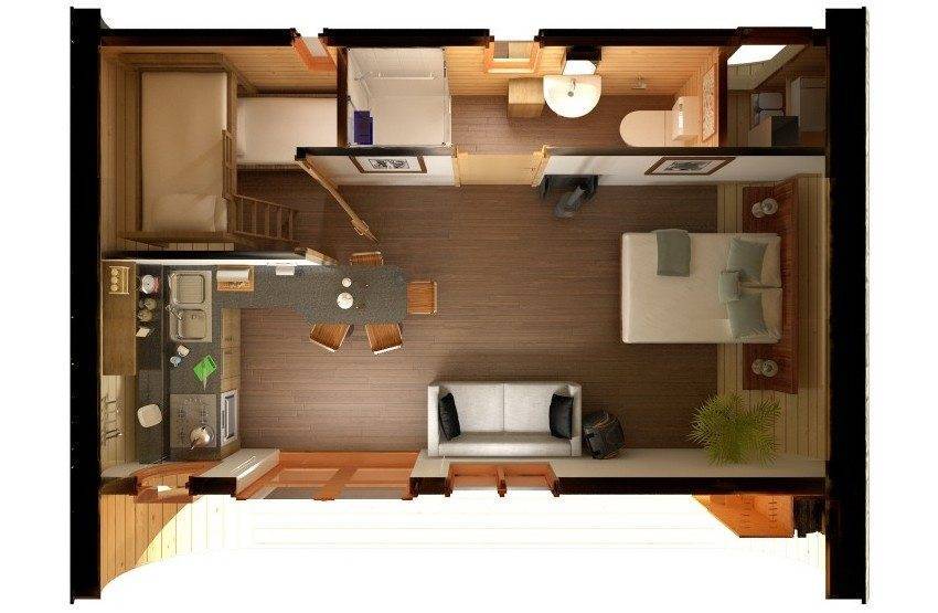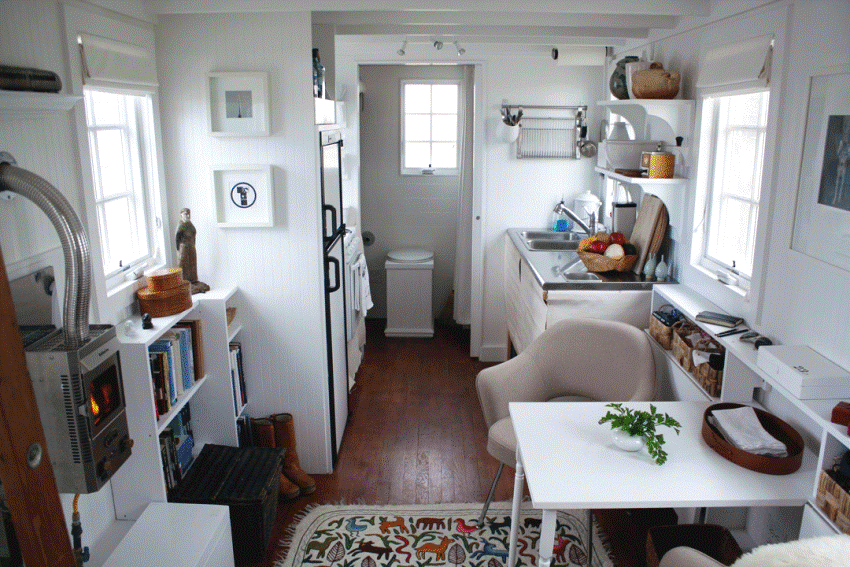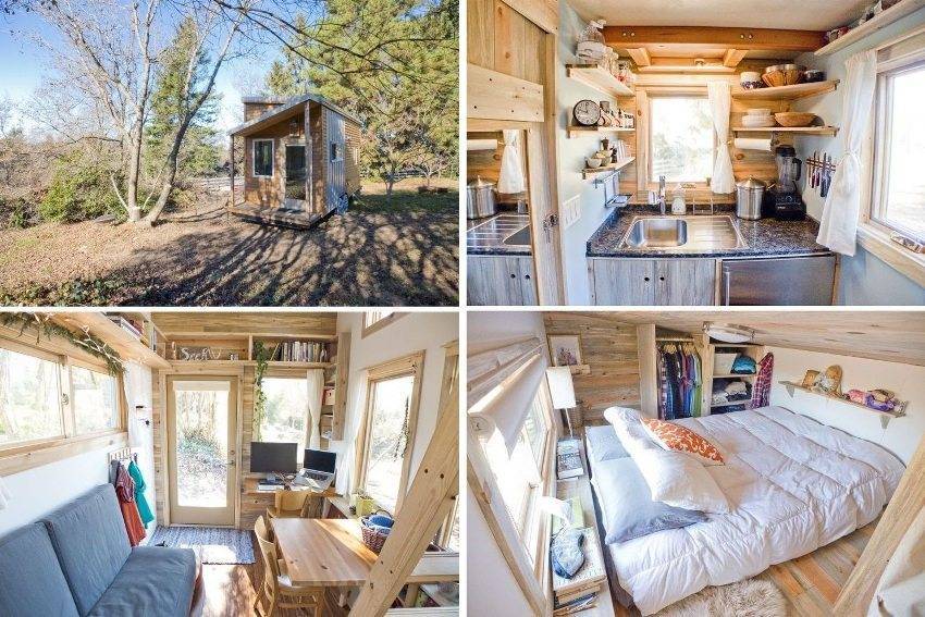 Отделка миниатюрного домика Источник teenyabode.com Очень удобны двухъярусные конструкции. Часто используют «вагончики» разных размеров. На верхнем этаже обустраивают спальню, внизу – хозяйственные помещения. Между собой «комнаты» соединены при помощи полноценных лестниц или устойчивых стремянок.