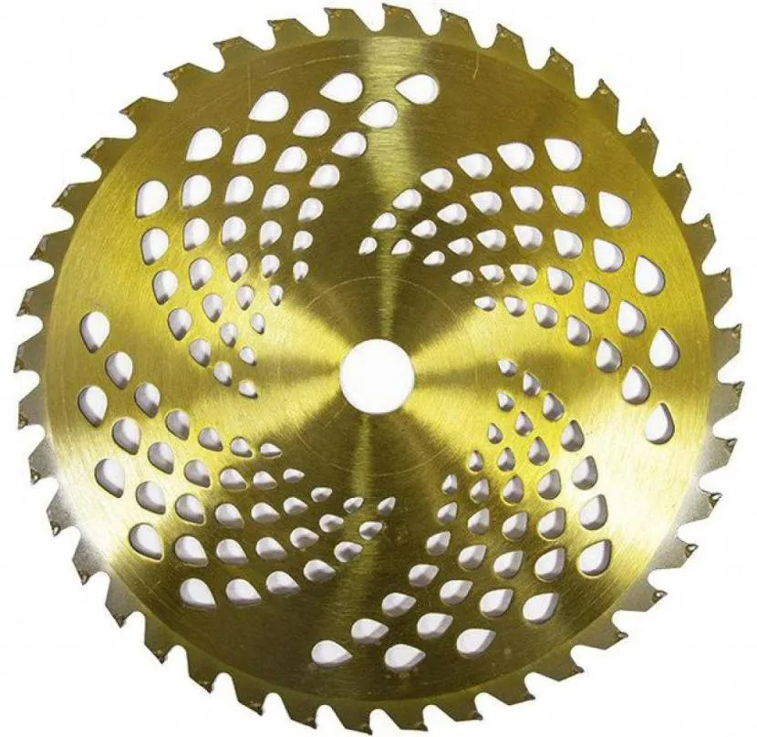 - Металлические диски с мелкими зубьями в количестве 40-80 штук — предназначены для укоса разной растительности. Это может быть грубая трава, бурьян, густые заросли и даже мелкие деревья. Чем больше количество зубьев на режущей насадке, тем выше эффективность рассматриваемого инструмента