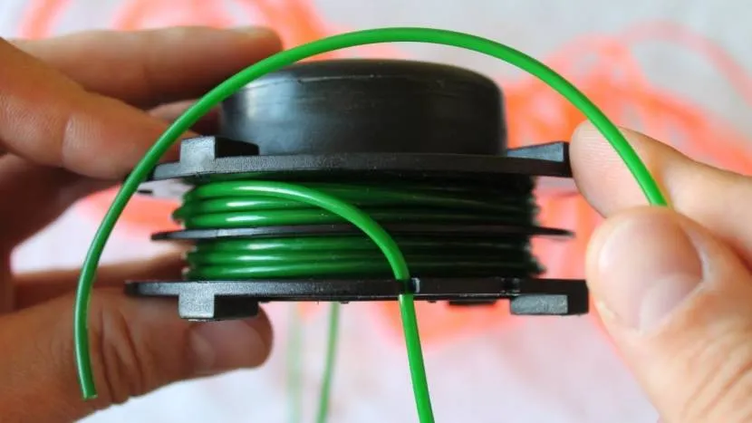- Порванную леску реально заменить самостоятельно. Для этого можно выбрать нейлоновый или капроновый материал, от 0,9 до 1,5 мм в диаметре (свой лучше знать заранее). Барабан разбирается вручную, леска наматывается, после чего её можно собрать.