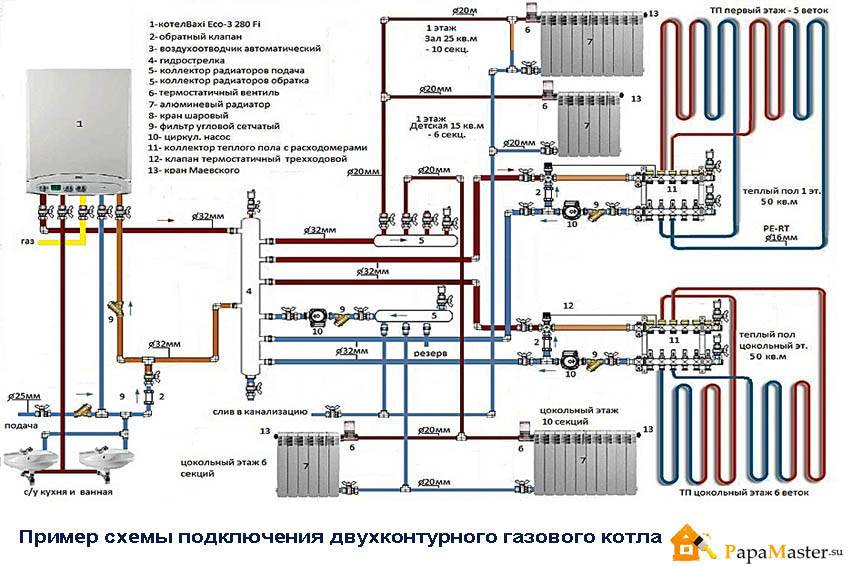 Для обвязки напольного газового котла с разветвленными сетями отопления, и большой протяженности, рекомендуется обвязывать 2 коллектора, с автономным насосом, например, один для низкотемпературного теплоносителя до 50 С системы «теплый пол», а другой до 90 С для обычных радиаторов.
