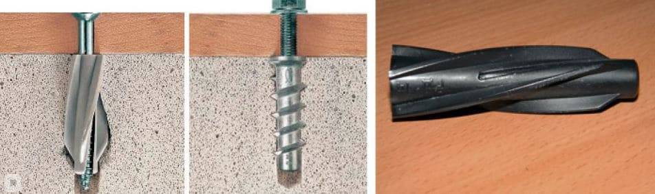 Пример креплений для ненадежных стеновых перекрытий. В пустотелых материалах (пенобетон, газобетон) используются дюбели следующего вида: