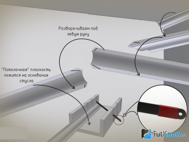 - Внутренний угол потолочного плинтуса формируется из двух элементов: первый заводим справа в стусло и обрезаем справа налево, второй заводим слева и обрезаем слева направо.
