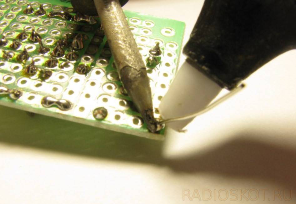 Далее вы берете кончиком немного припоя и аккуратно припаиваете в нужном месте. Это не слишком сложный процесс, но он требует «набитой» руки, и в самый первый раз у вас вряд ли получится красивая и аккуратная спайка.