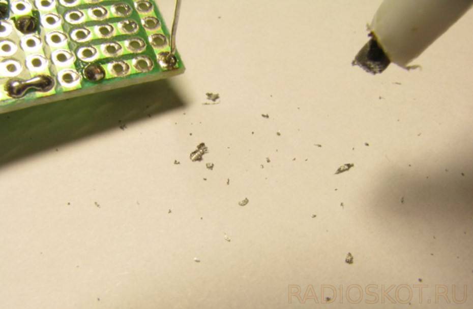 При работе полуда будет обгорать и стираться, поэтому паяльник придется очищать и лудить в процессе пайки несколько раз. Очистить жало можно о кусочек наждачной шкурки.