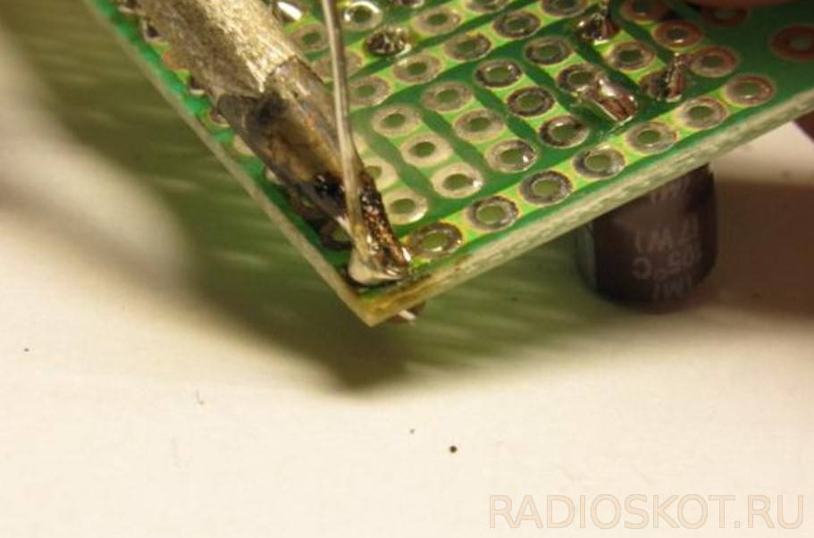 - Второй вариант – это перетягивание припоя с места припайки на медные провода, смоченные флюсом, таким, например, как спиртовая канифоль. Нагреваемый паяльником провод с флюсом постепенно перетягивает на себя припой с места пайки. Этот вариант занимает больше времени, но также достаточно эффективен;