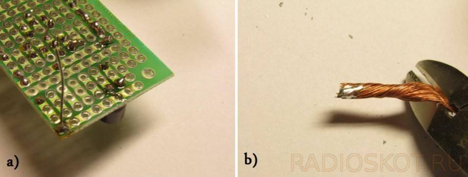 а) Отдельные точки пайки; b) излишки олова собранные оплеткой