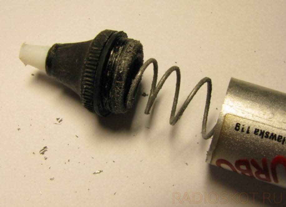 Нажмите на поршень в верхней части всасывающего устройства. Подносим наконечник ближе к тому месту, с которого хотим удалить излишки олова. При этом нагреваем припой горячим паяльником.
